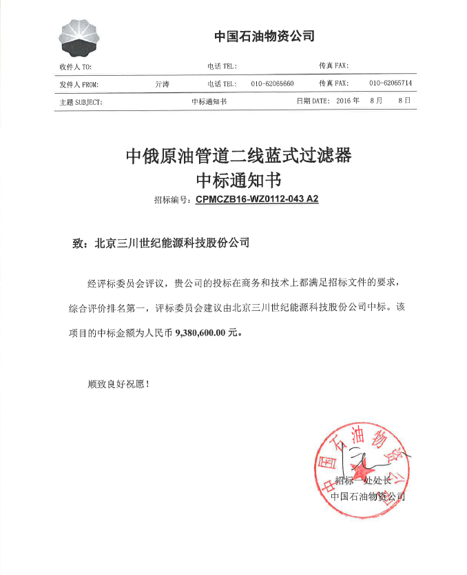 2016年8月8日,北京三川世紀(jì)能源科技股份公司收到中國石油物資公司發(fā)來的中標(biāo)通知書,確認(rèn)北京三川世紀(jì)能源科技股份公司為中俄原油管道二線工程籃式過濾器設(shè)備的中標(biāo)單位,該項目合同金額為938.06萬元。