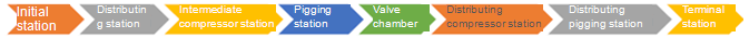 Initial station: receiver and launcher, filter separator, metering skid, pressure regulating skid, vent riser, blowdown drum.